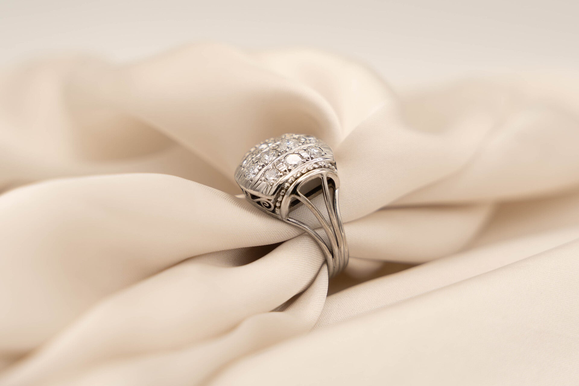 Laat je betoveren door de verfijnde elegantie van deze handgemaakte appliek ring, een juweel dat vakmanschap en luxe perfect verenigt. Gemaakt van 14 karaat witgoud en rijk bezet met schitterende witte briljanten, is deze ring een waar kunstwerk voor wie houdt van tijdloze schoonheid.