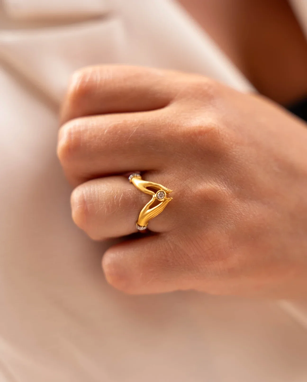 Unieke 18 Karaat Geelgouden Damesring – Twee Handen met Briljant