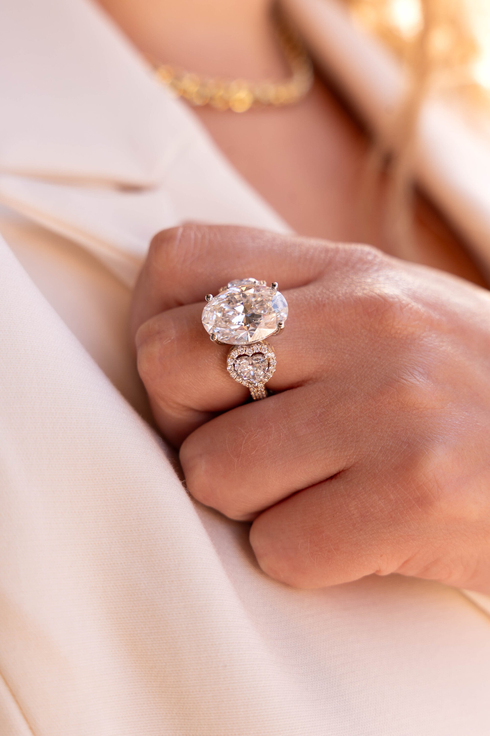 Aan weerszijden van de centrale diamant bevinden zich twee hartvormige lab grown diamanten van 1.50 ct, die een romantisch en stijlvol accent toevoegen. Daarnaast is de ring rijkelijk bezet met briljant geslepen lab grown diamanten met een totaalgewicht van 0.48 ct, waardoor een fonkelend geheel ontstaat.