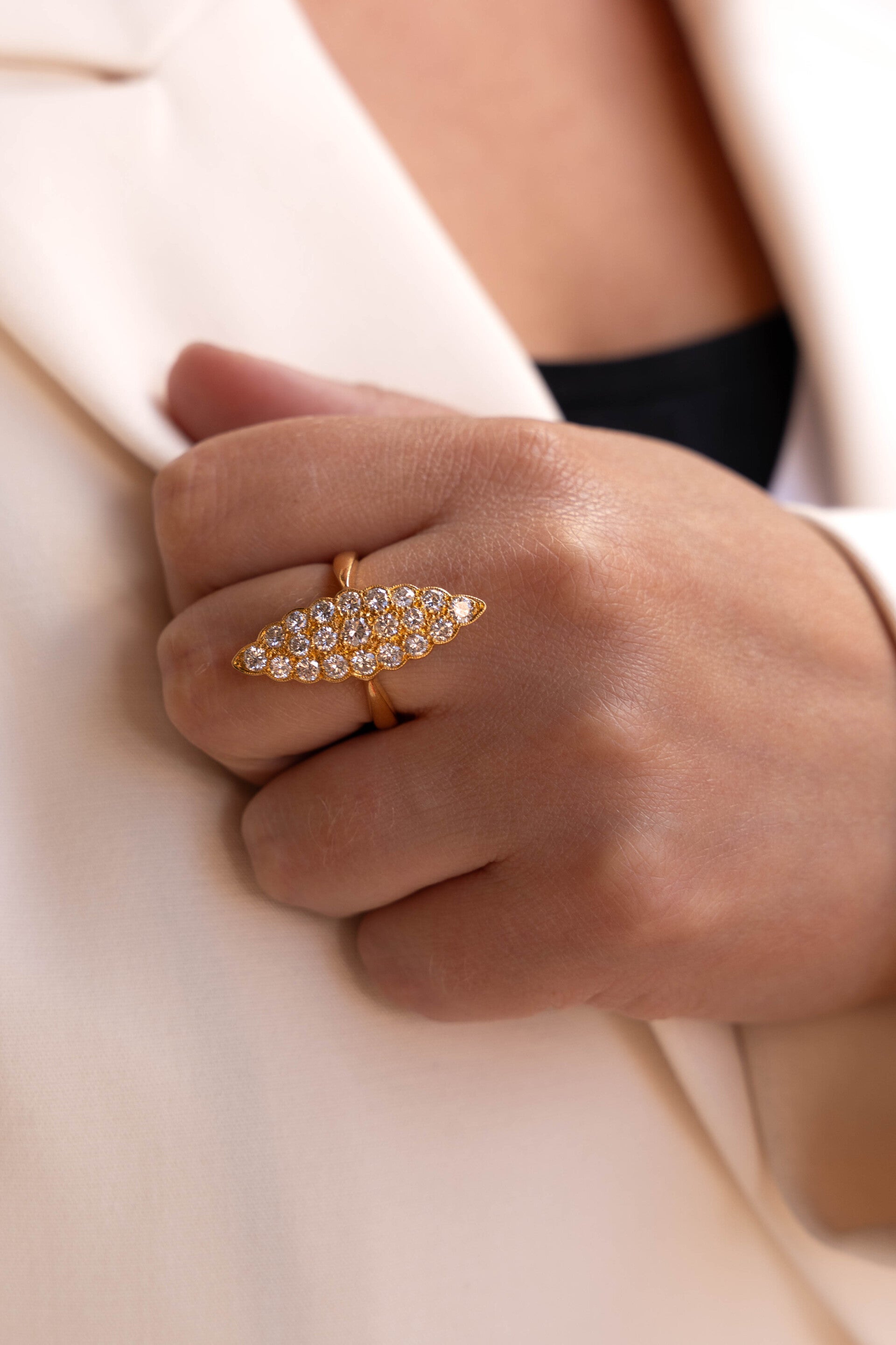 Deze indrukwekkende markies ring is een handgemaakt meesterwerk in 22 karaat goud, rijkelijk bezet met sprankelende diamanten van in totaal 1.80 karaat. De diamanten zijn briljant geslepen, waardoor ze een schitterend lichtspel geven bij elke beweging.